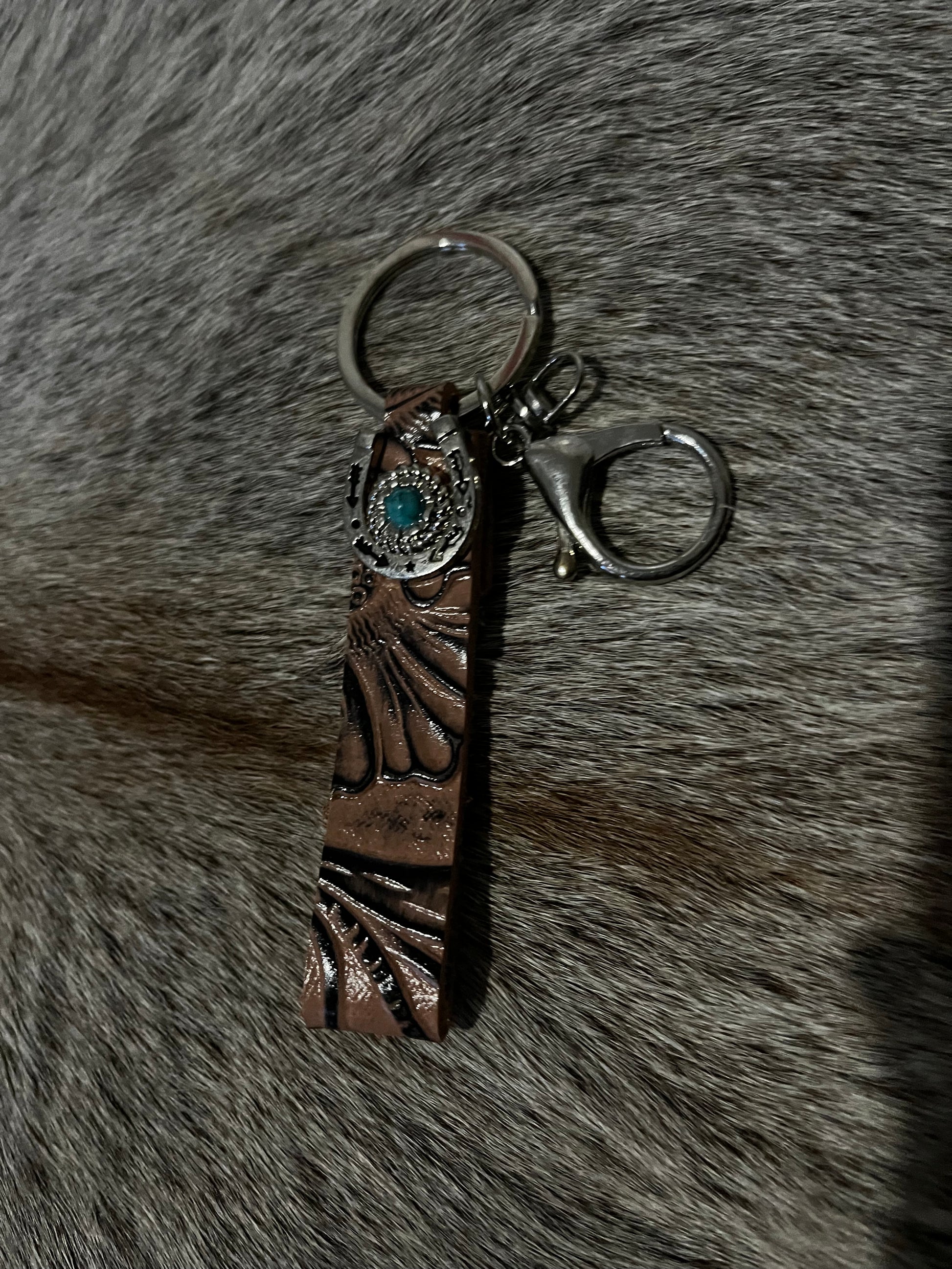 This boutique western keychain is handcrafted with attention to detail, combining rustic charm with everyday practicality. Featuring a unique design with a turquoise accent that captures classic western. Lightweight, this keychain is perfect for keeping your keys secure while adding a touch of personality to your accessories.