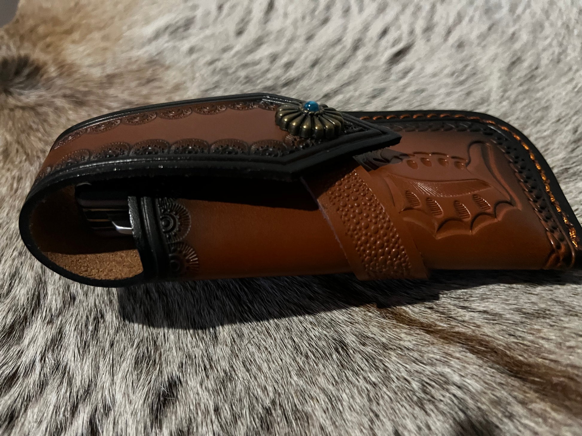 This tooled leather pocket knife pouch is crafted with attention to detail, combining durability with a touch of western style.